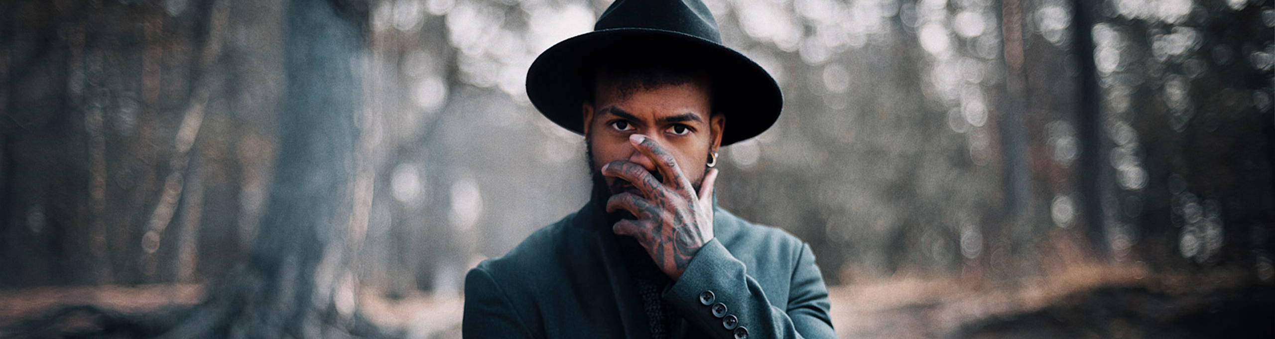 Smoke, texture and muted tones create a cinematic atmosphere, while the portrait remains intimate and direct.